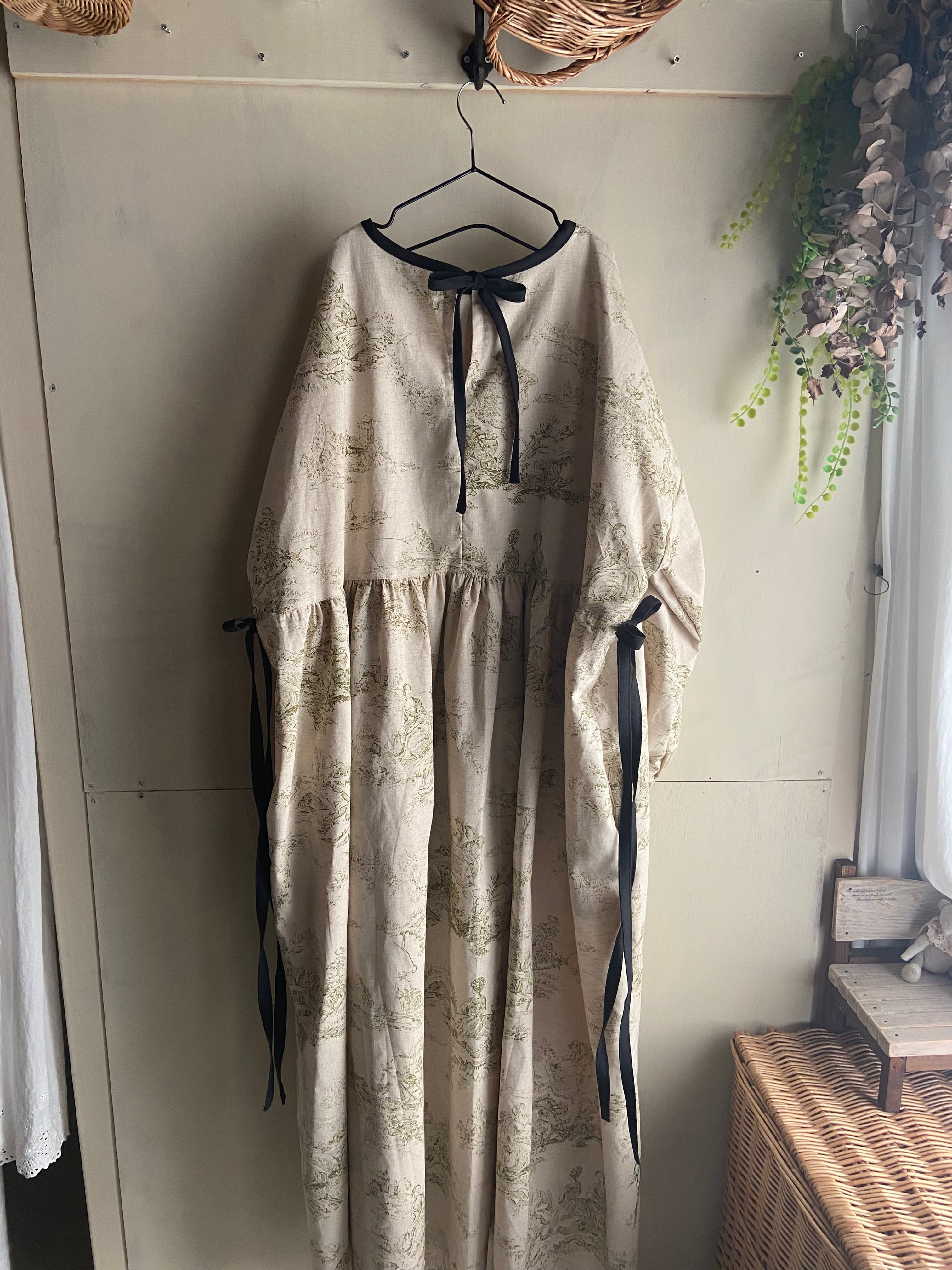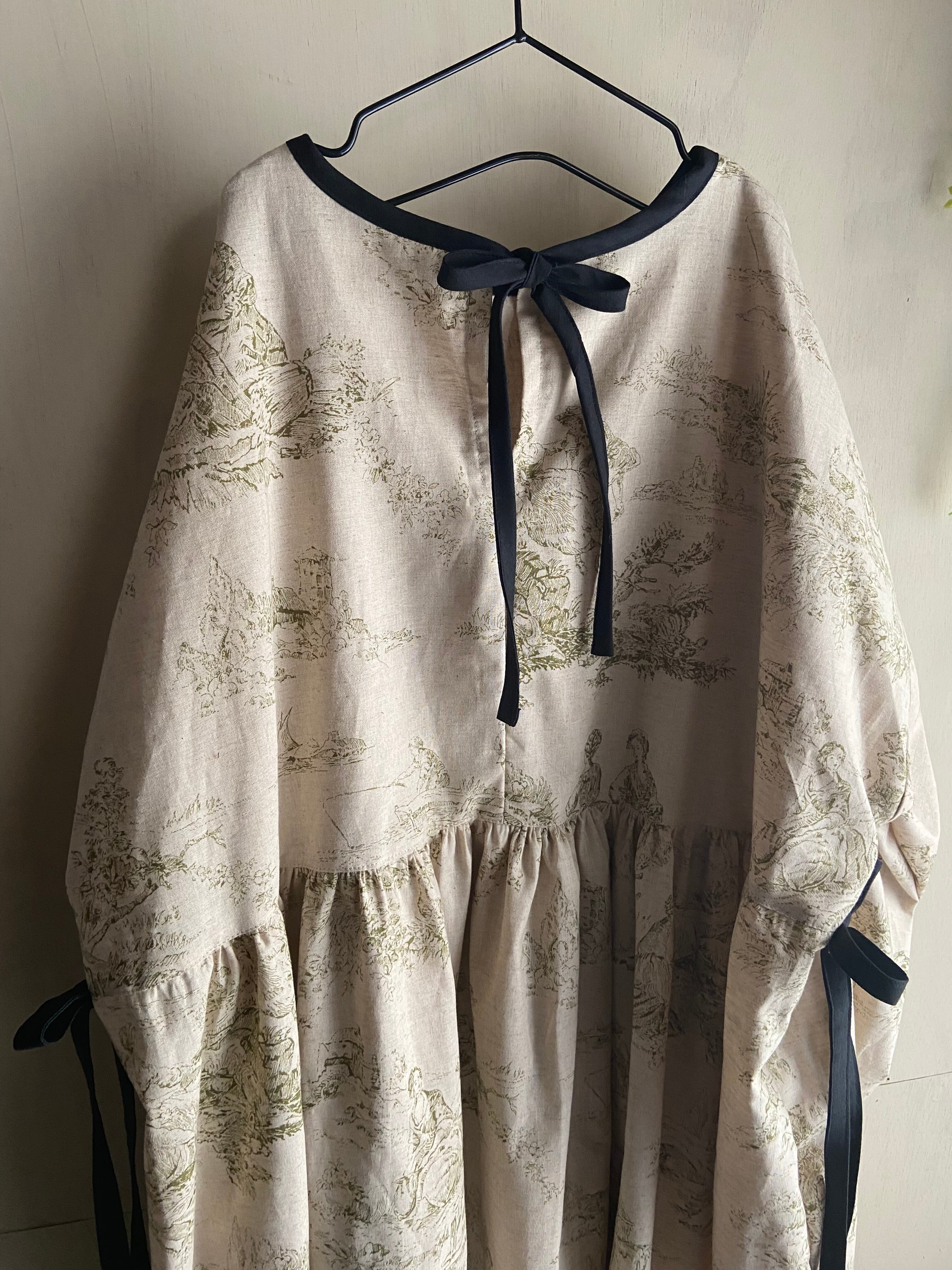 トワルドジュイサイドリボンギャザーワンピース コットンリネン