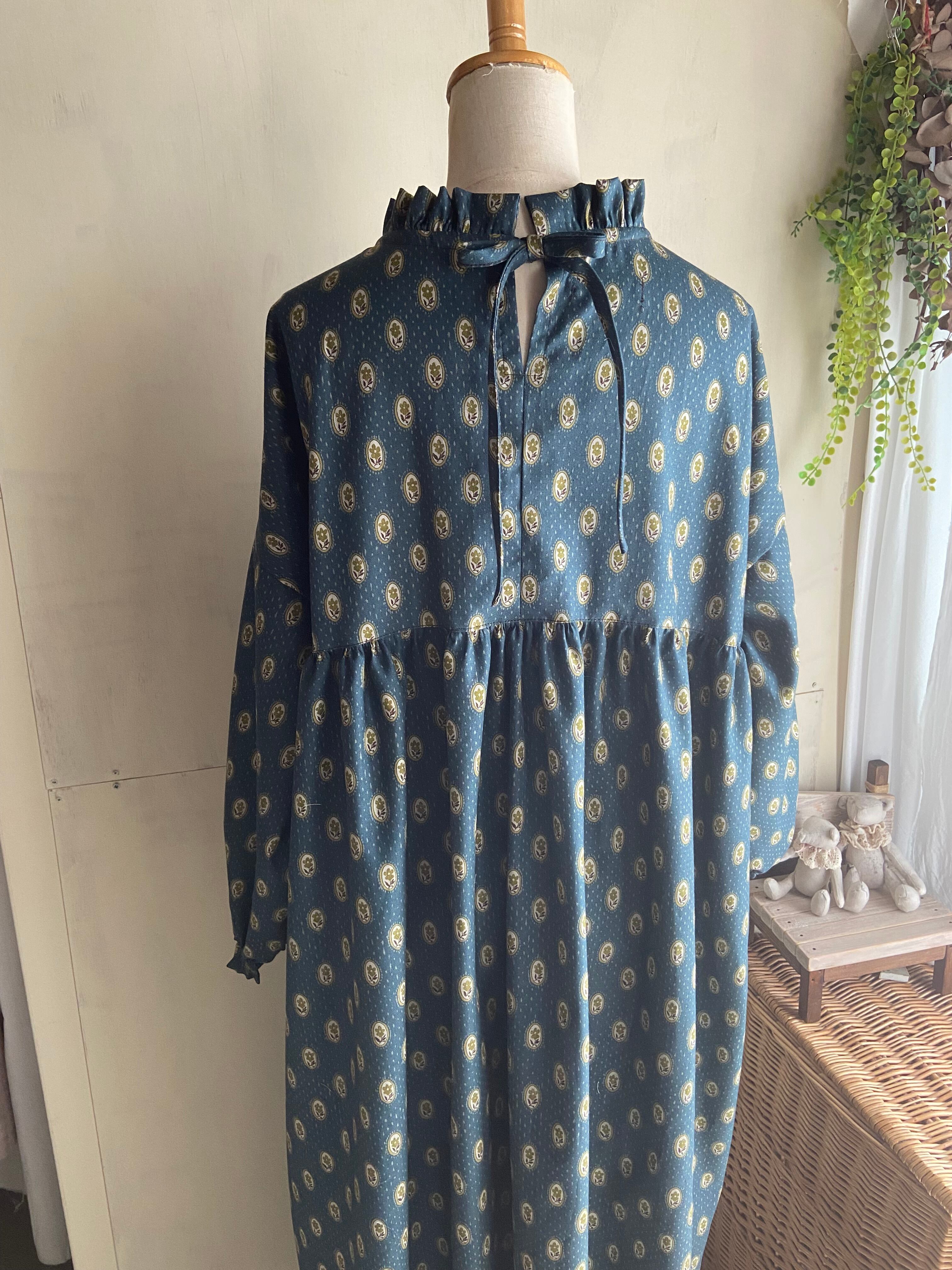 コットン コットンビエラ フリルリボンギャザーワンピース レトロ花柄