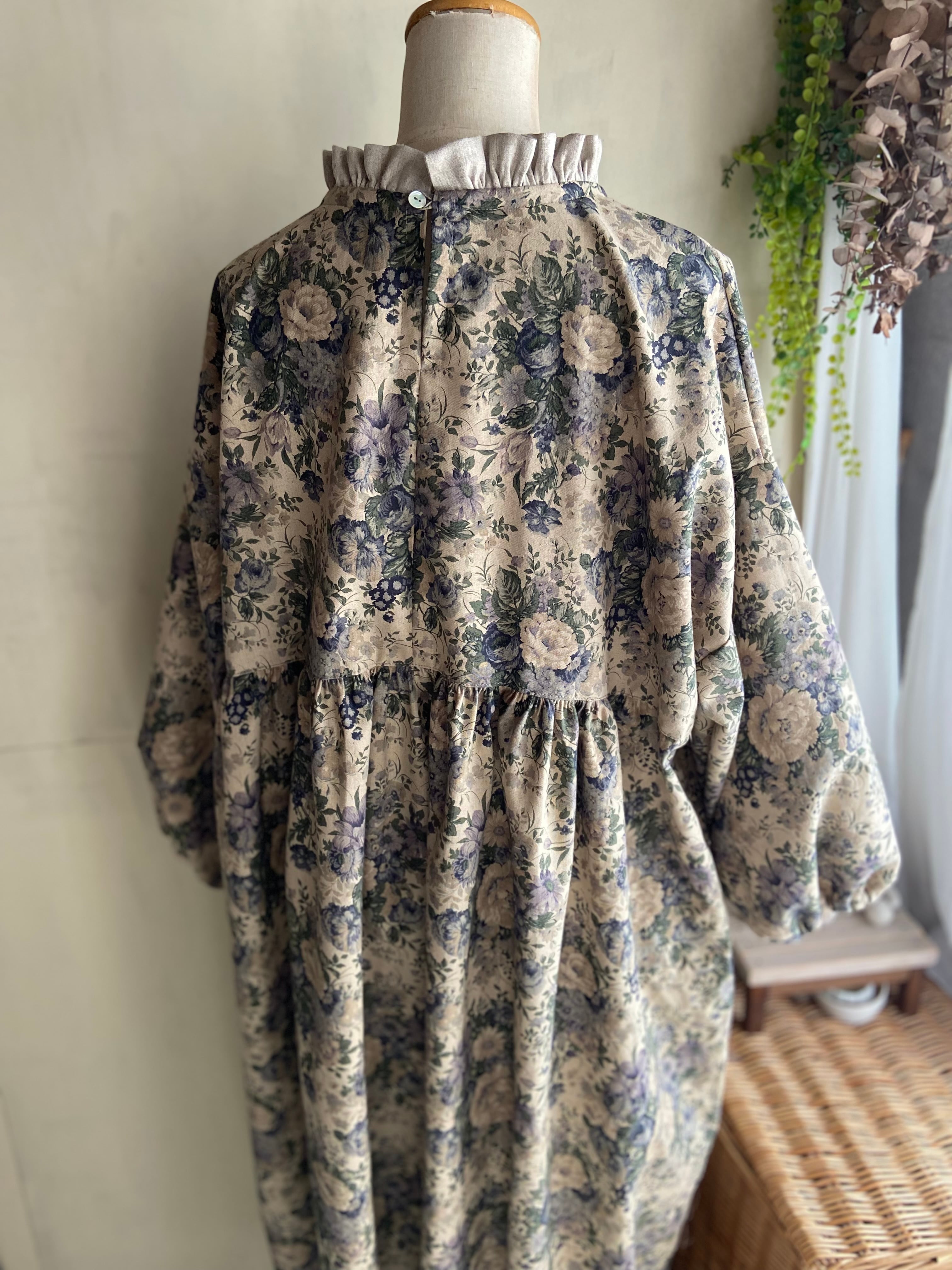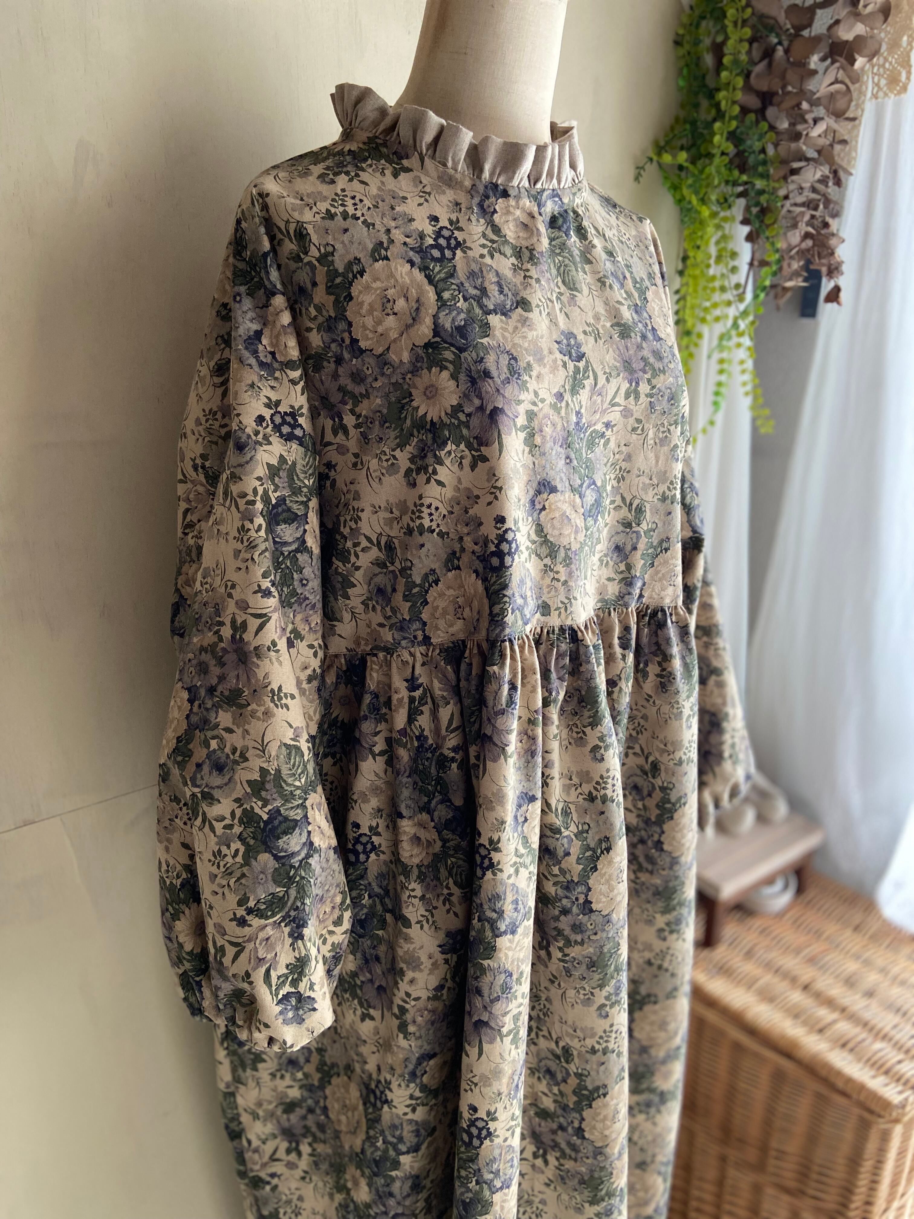 YUWAにコットンリネン生地を使用した花柄のギャザーワンピースです。