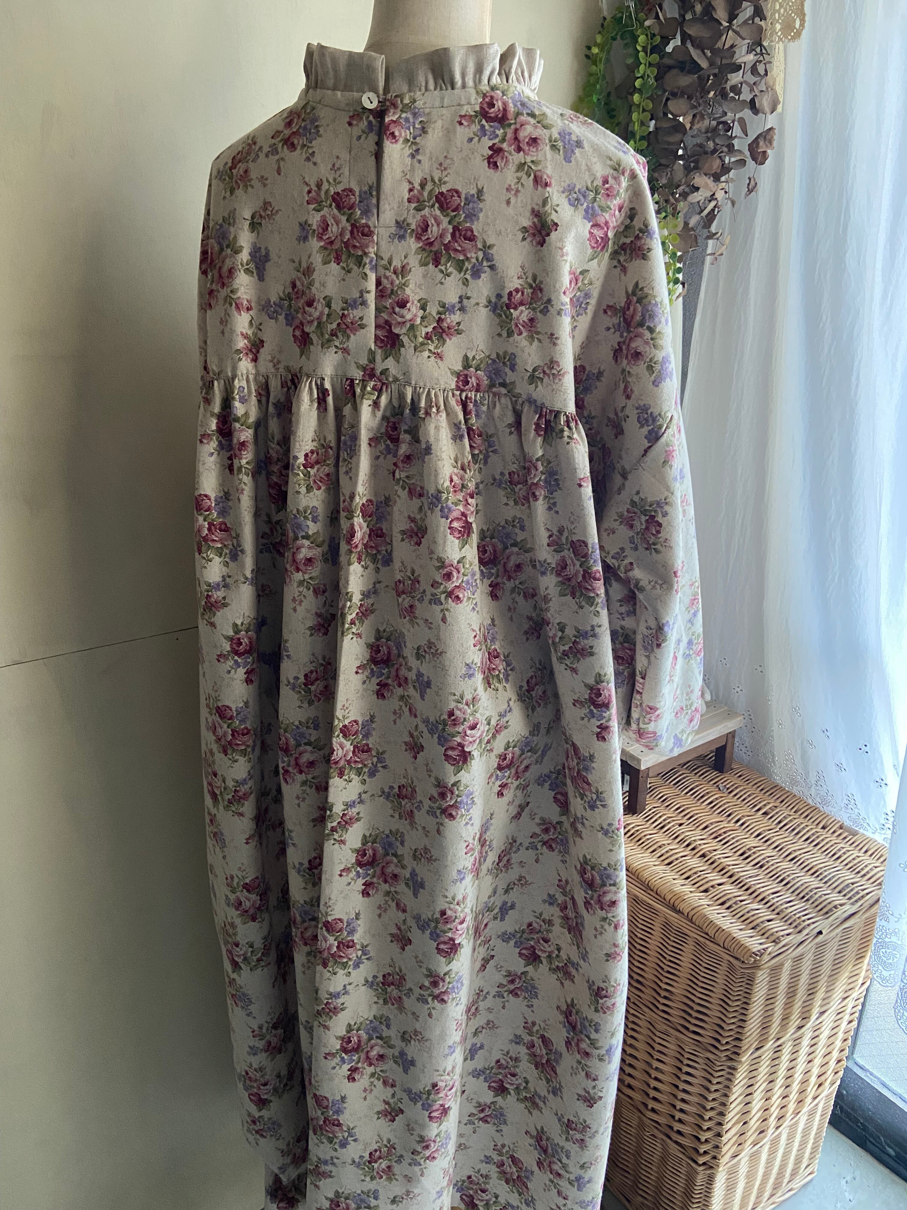 コットンリネン生地を使用した花柄のギャザーワンピースです。
