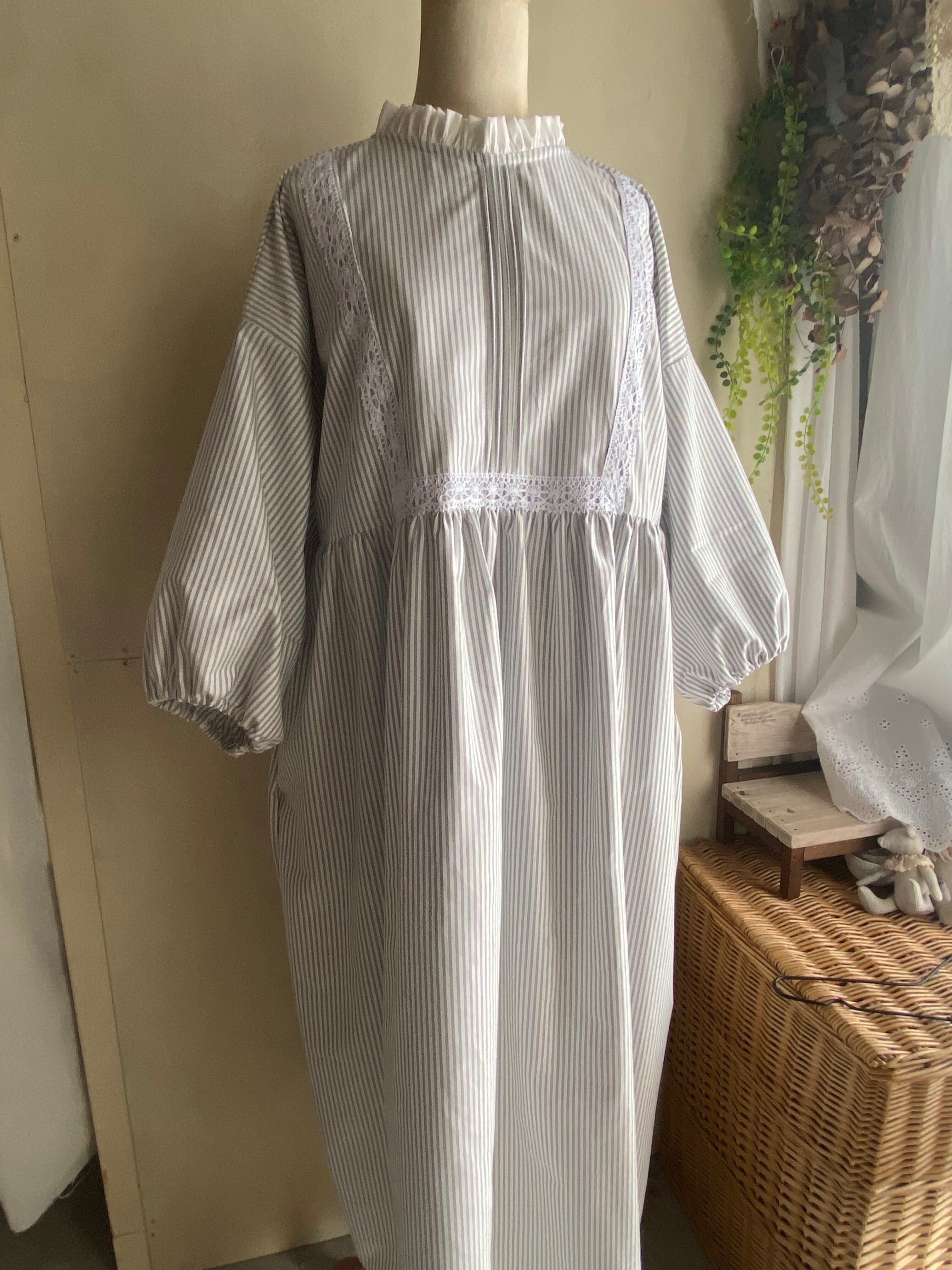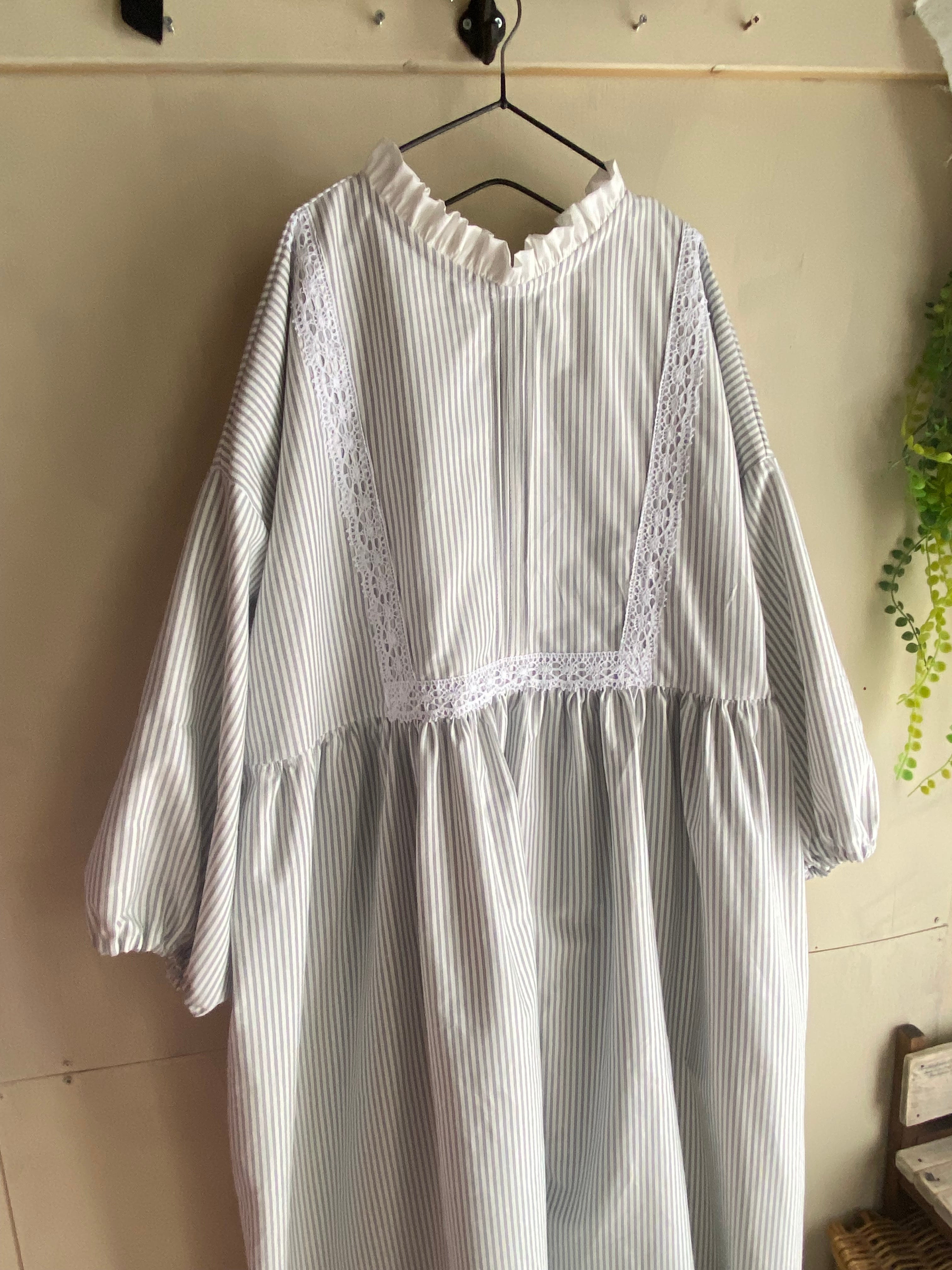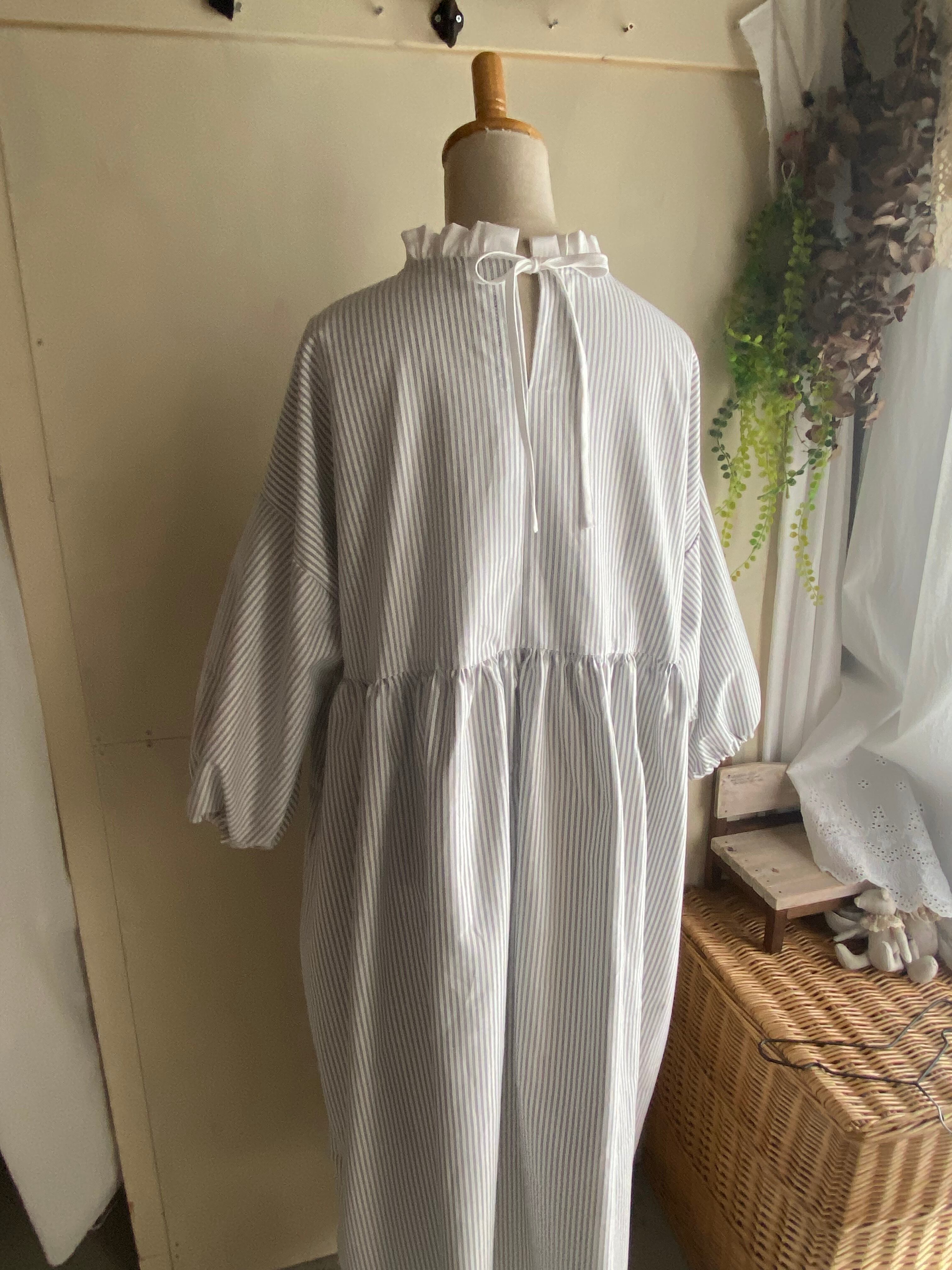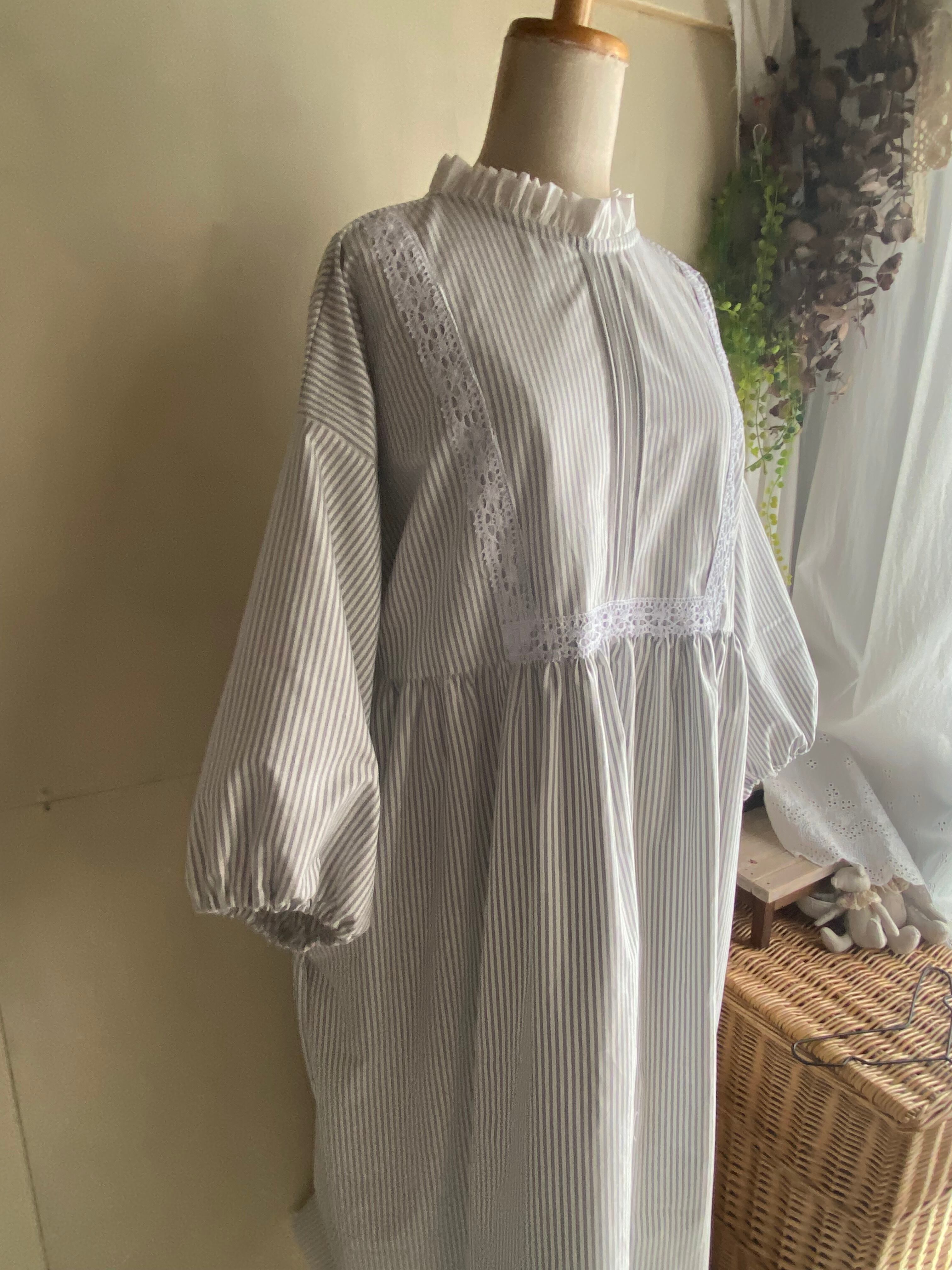 コットン生地 フリルレースギャザーワンピース ストライプワンピース ライトグレー ナチュラルワンピース
