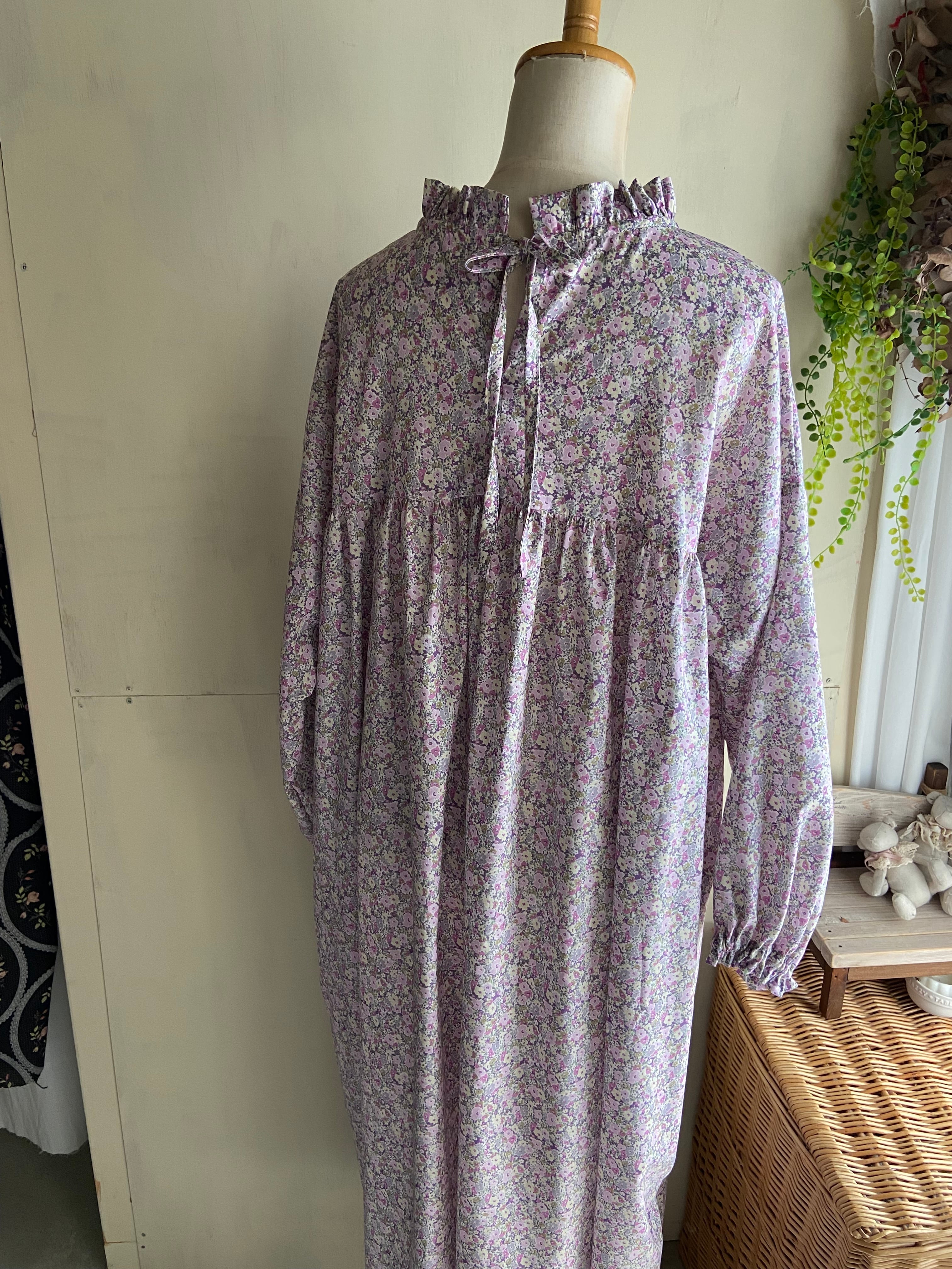 フリルヨークギャザーワンピース 小花 パープル コットン コットンワンピース
