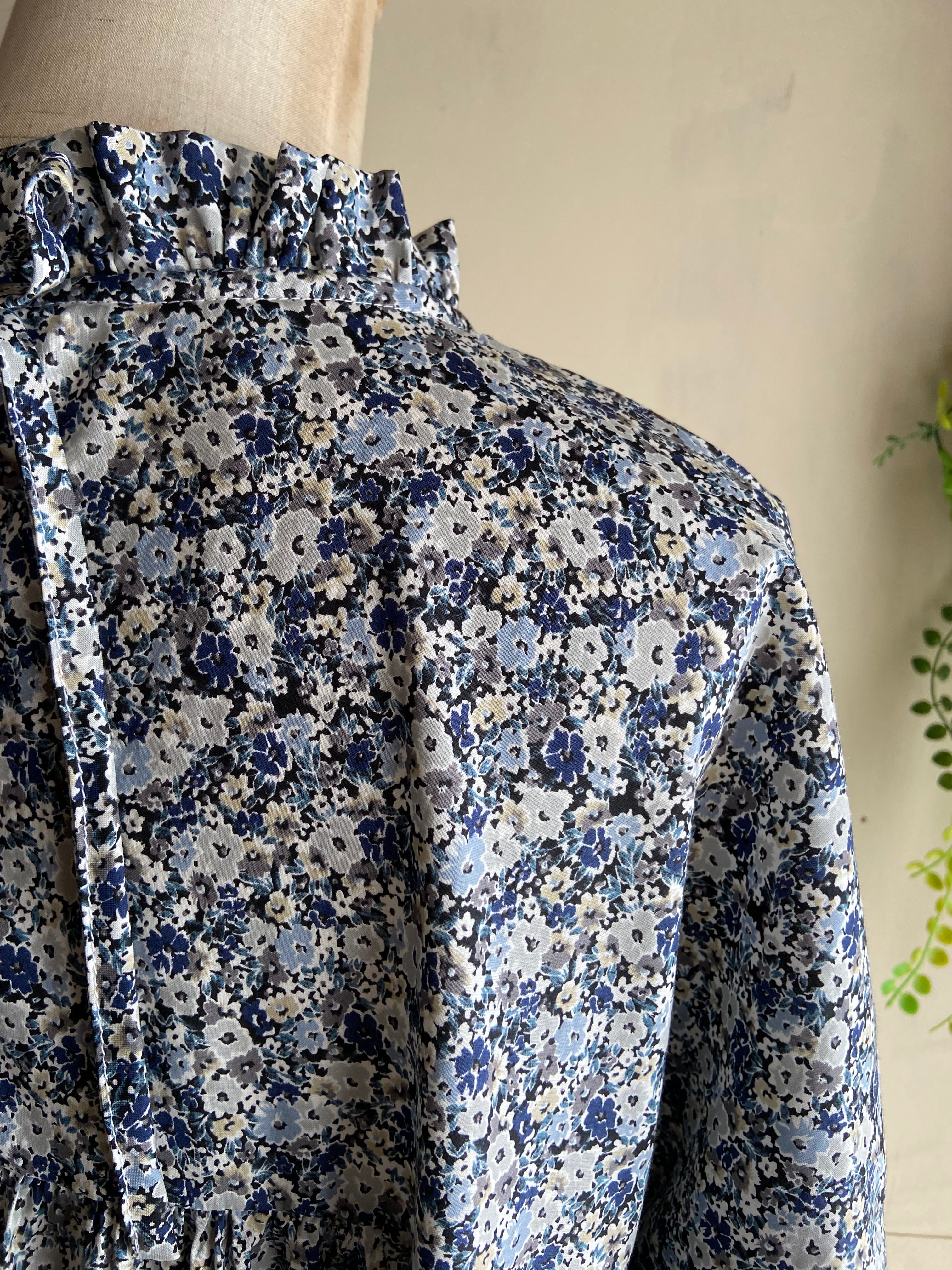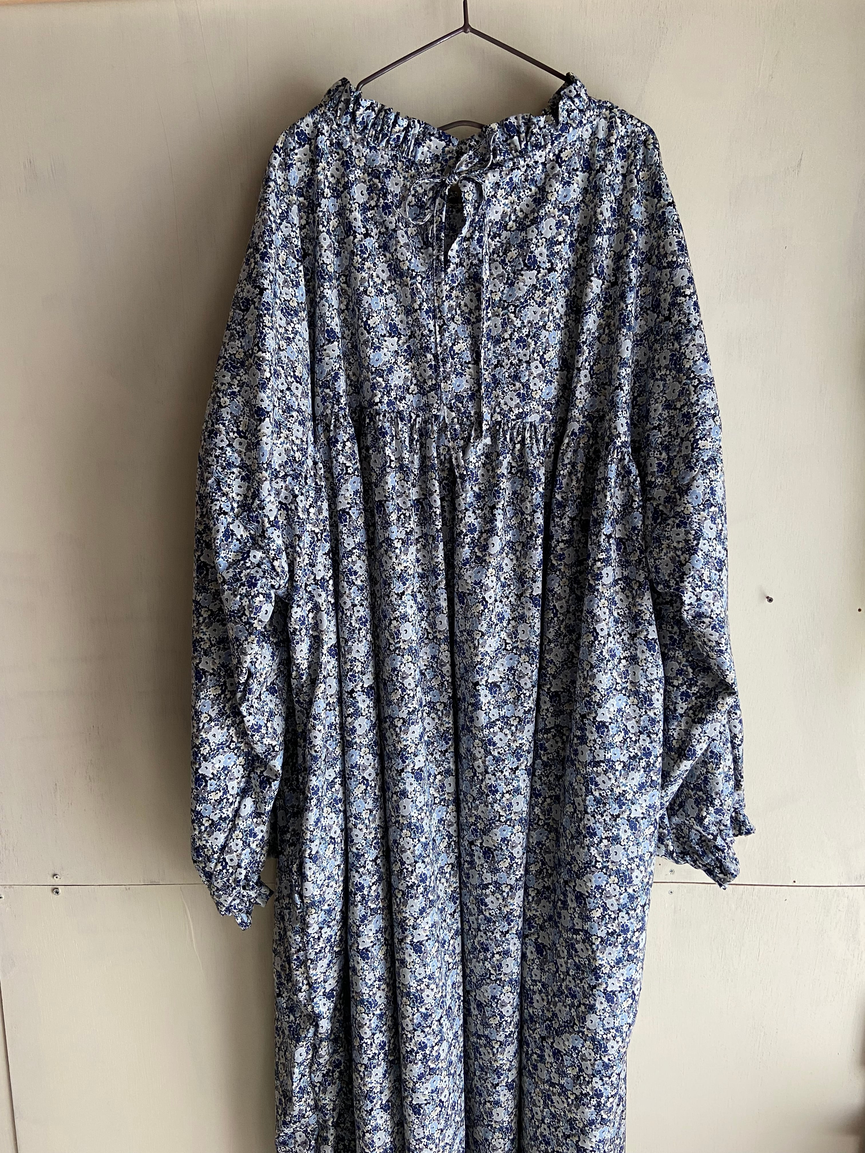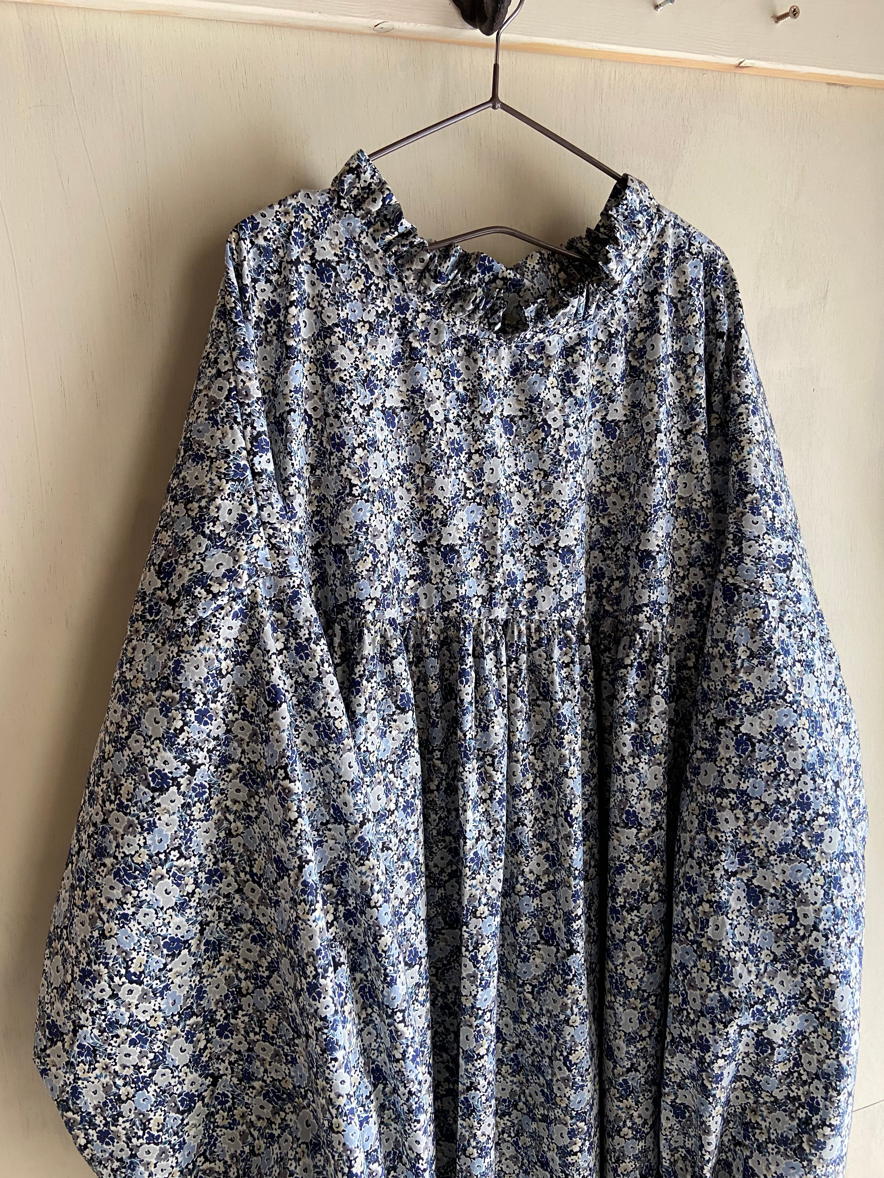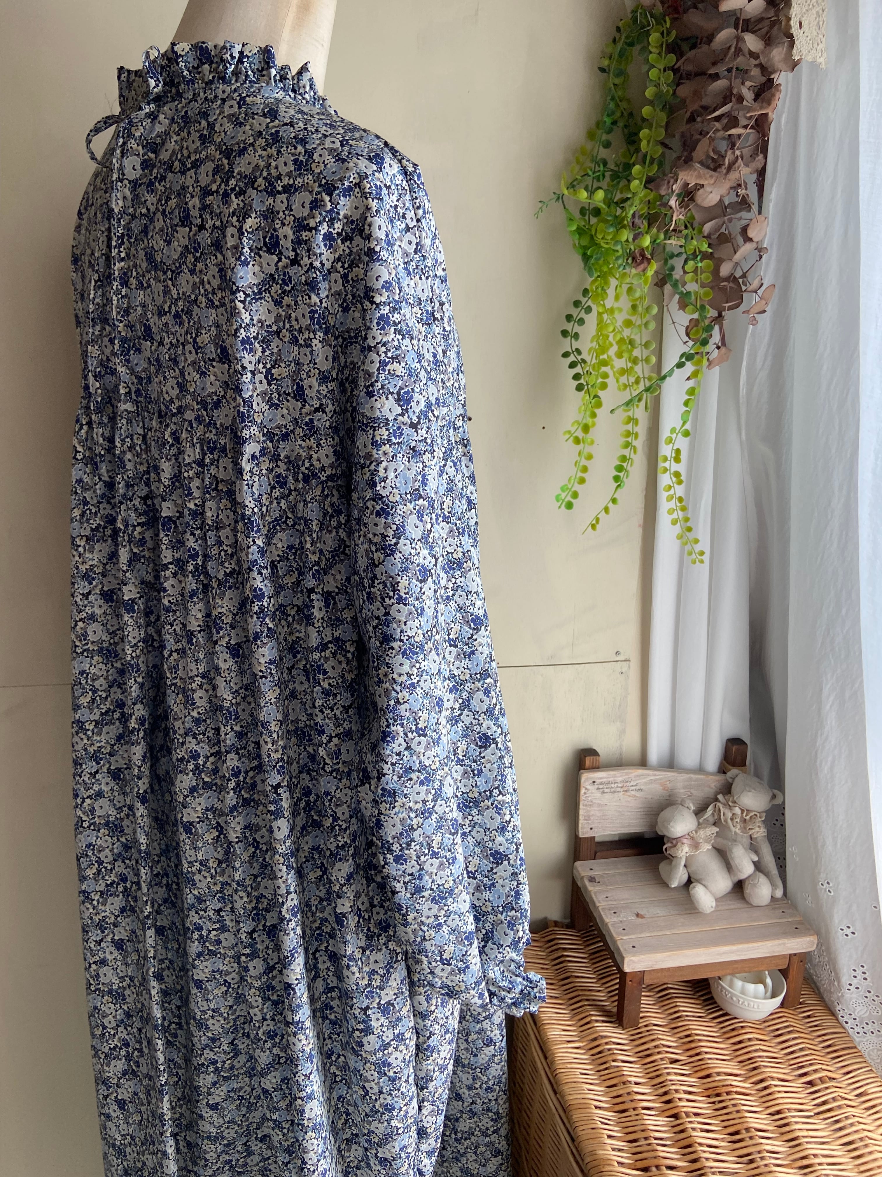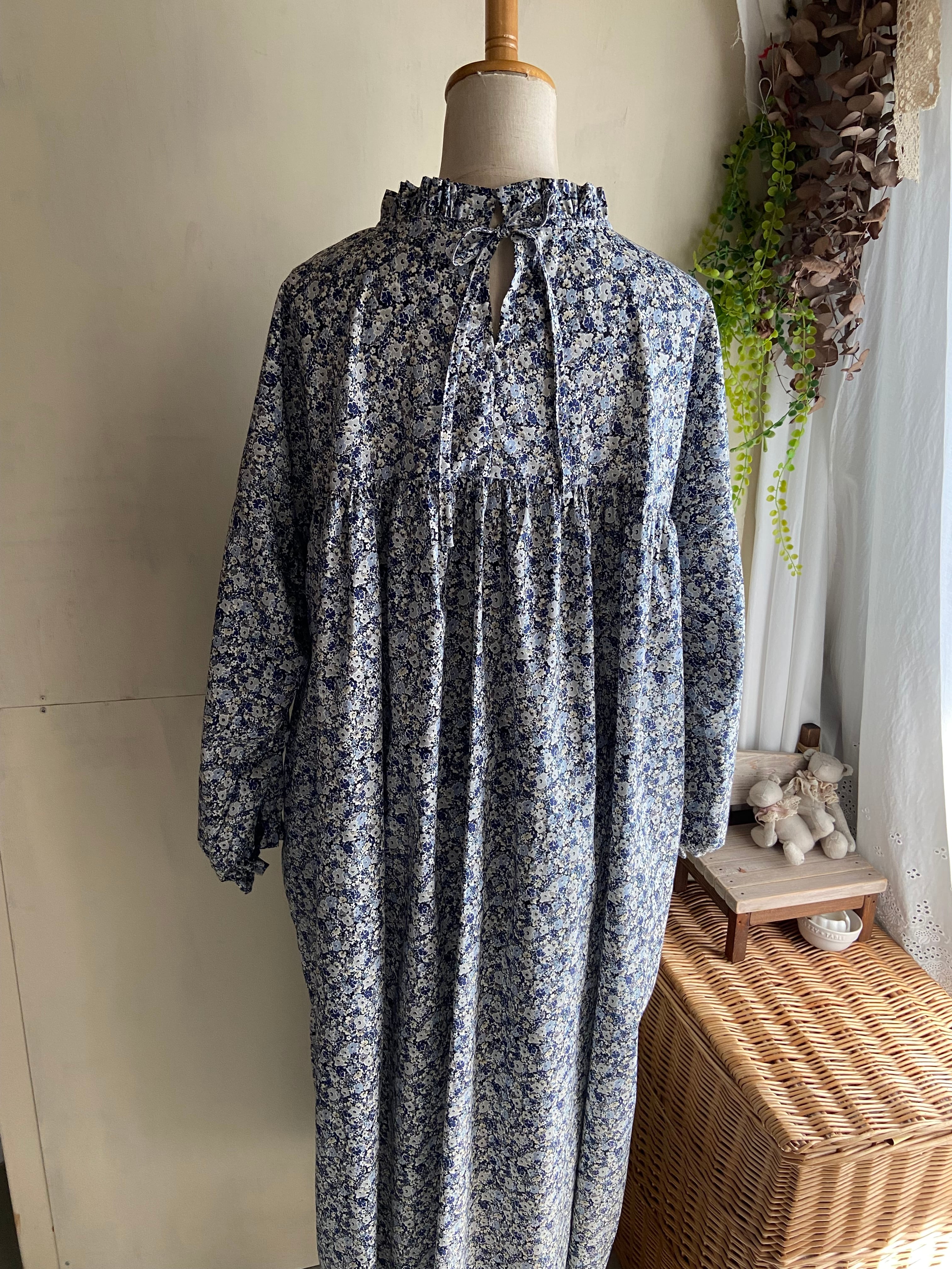 フリルヨークギャザーワンピース 小花 ネイビー コットン コットンワンピース