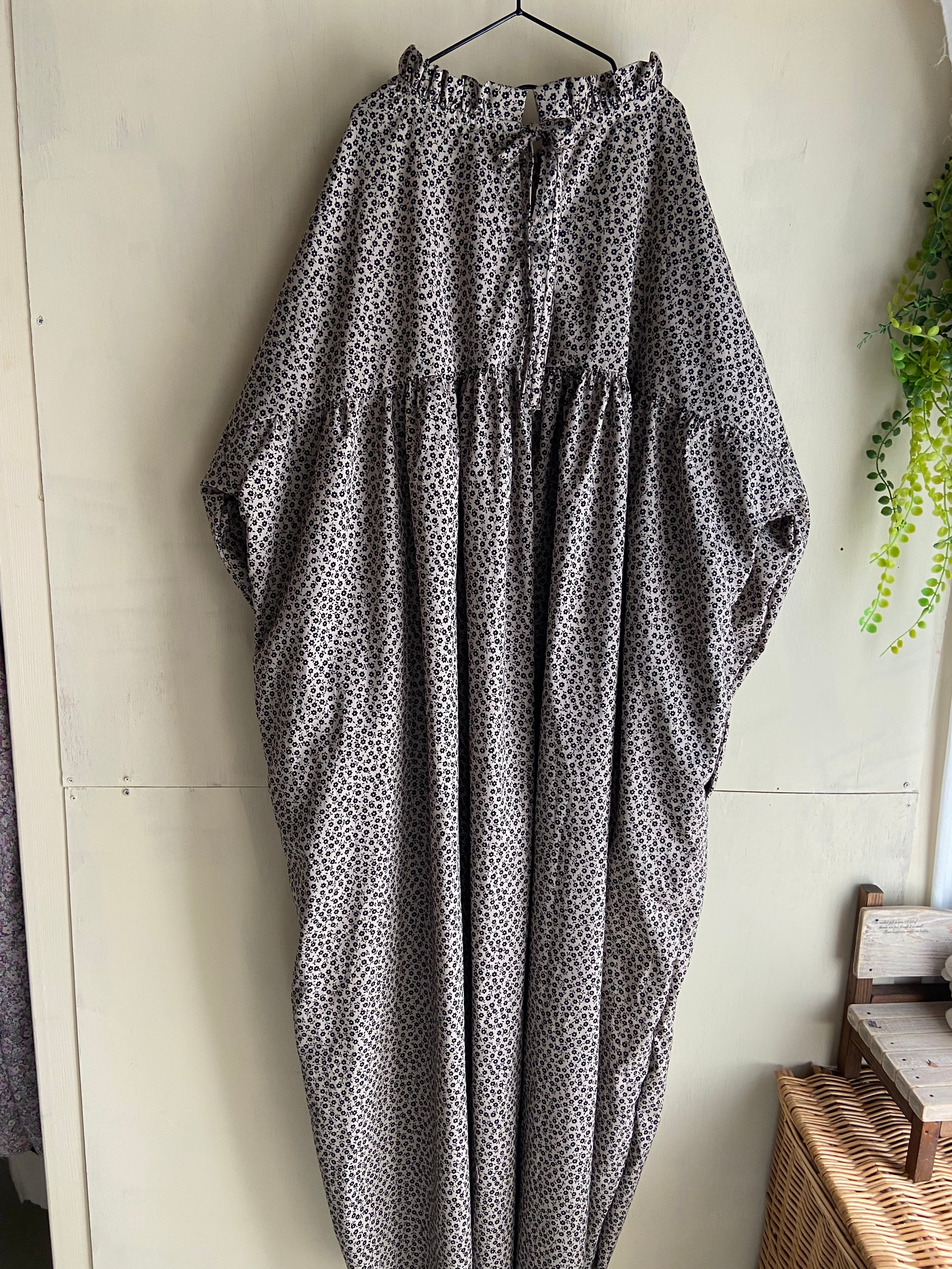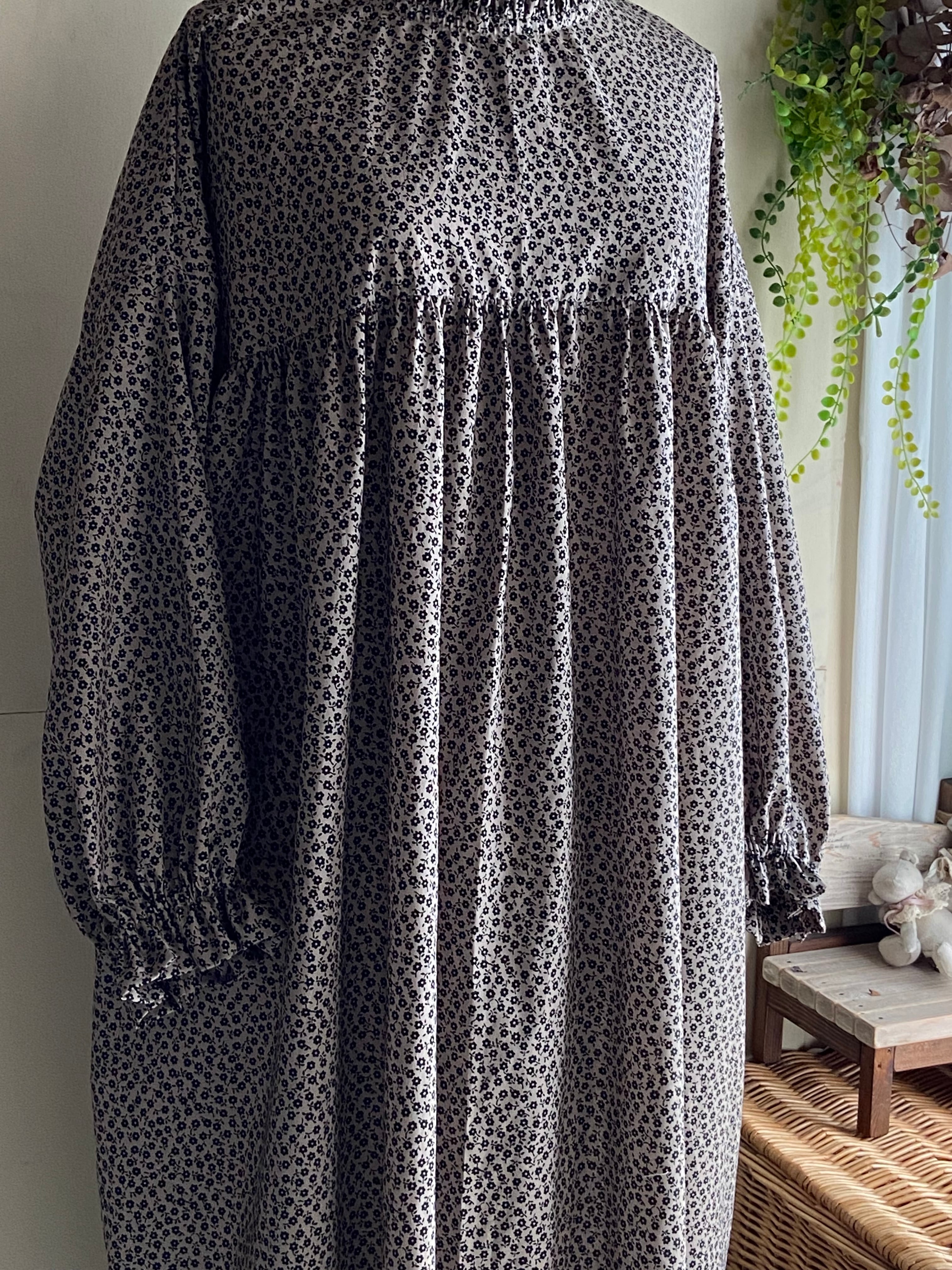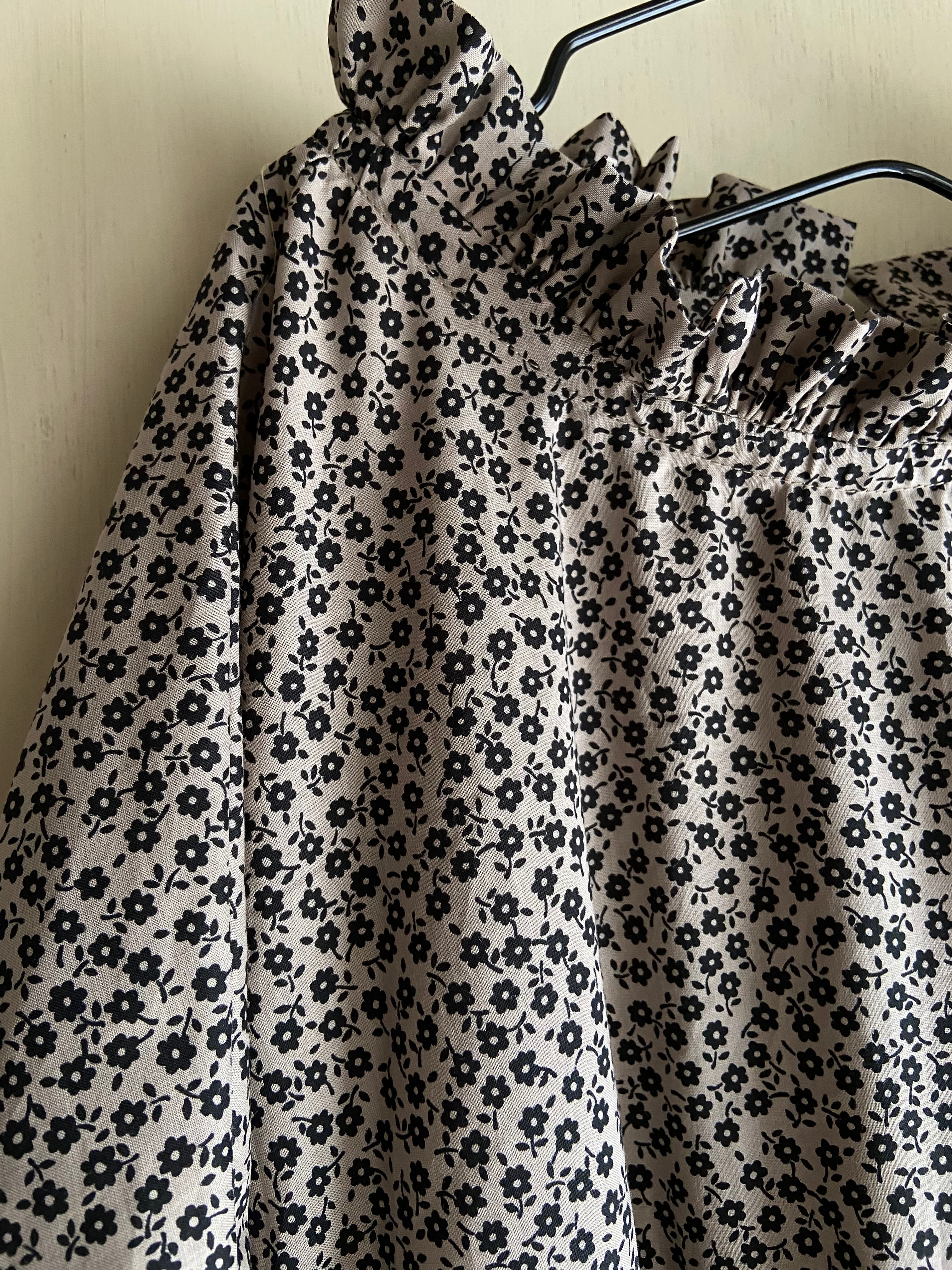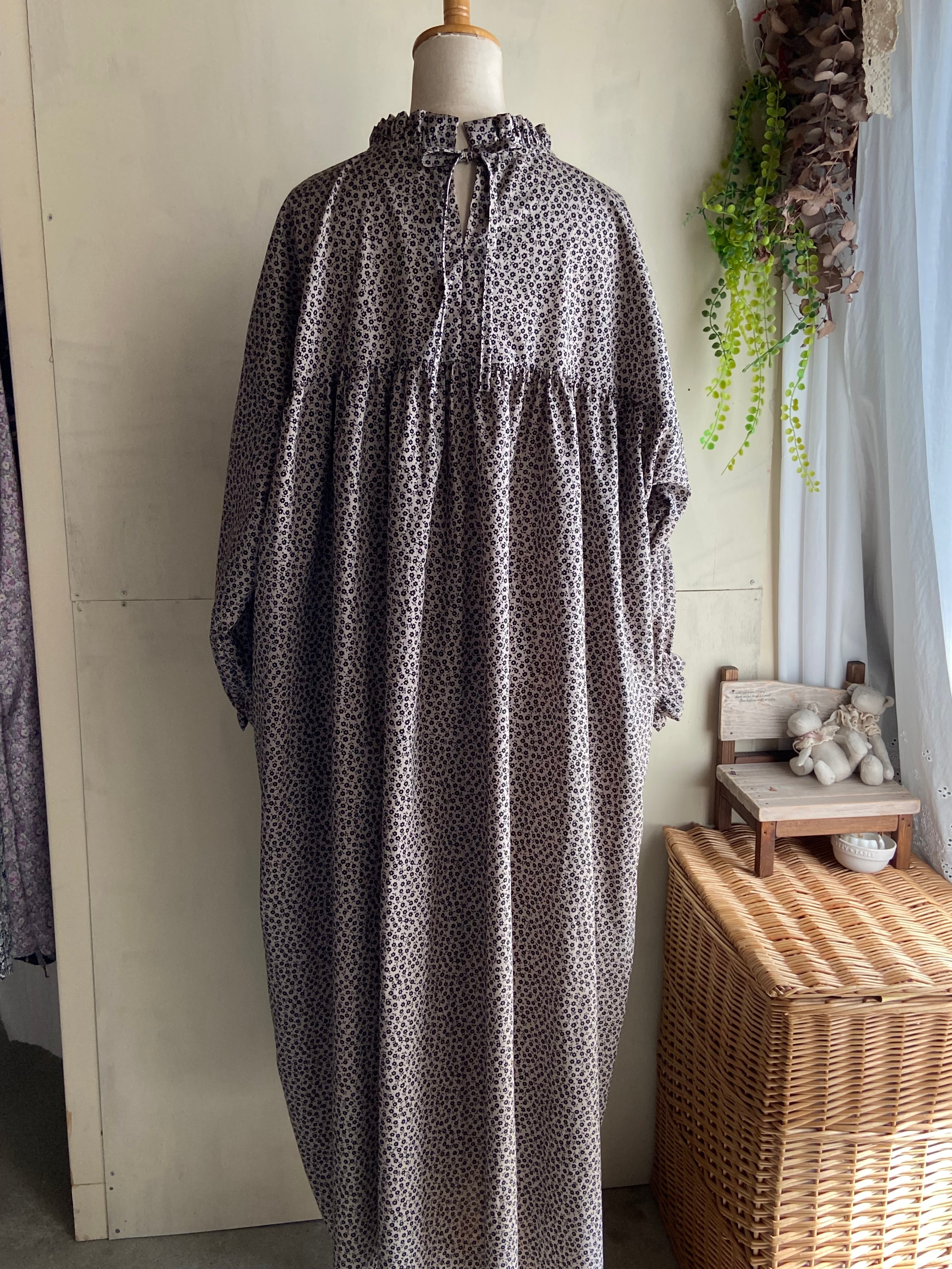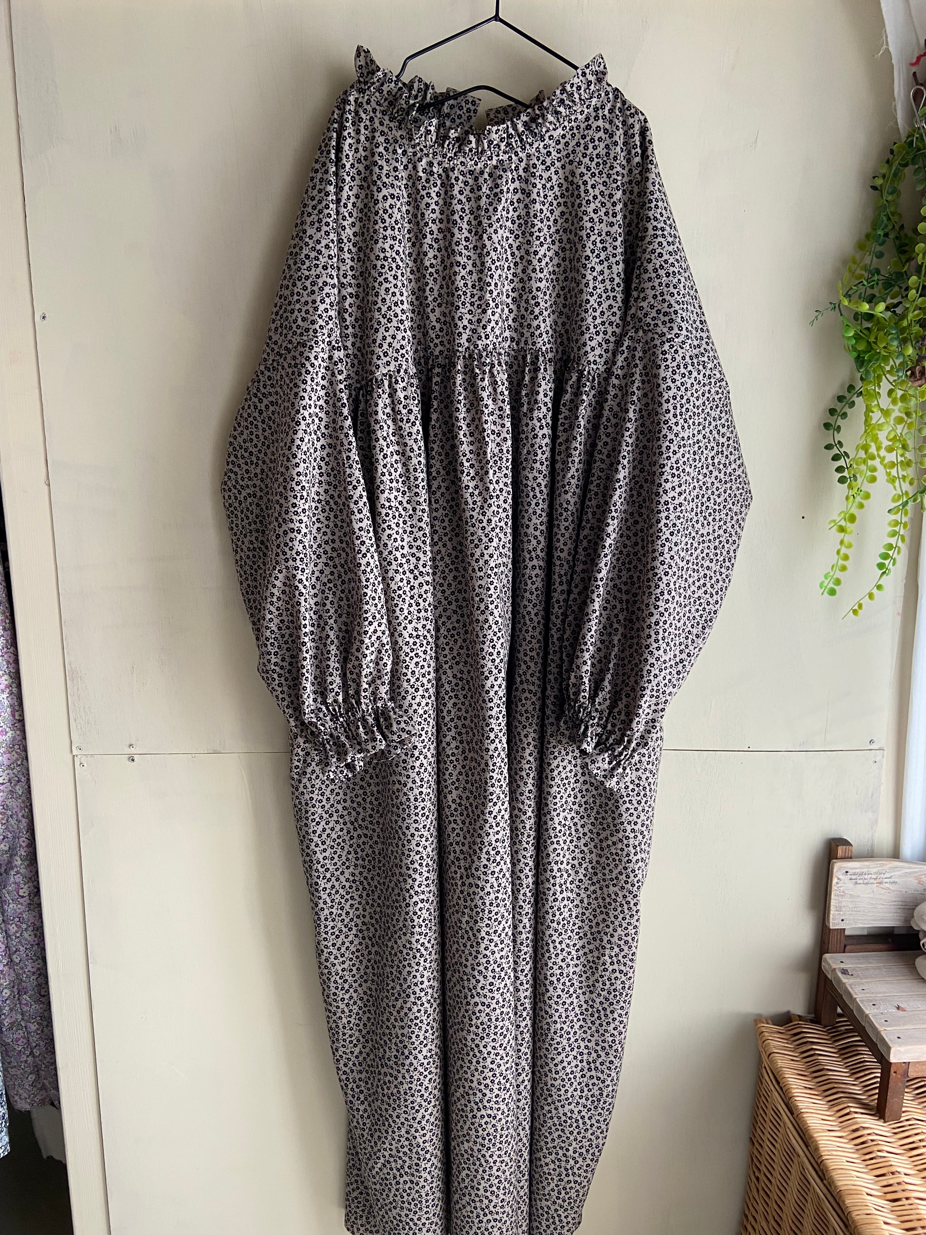 フリルヨークギャザーワンピース 小花 ブラウン コットン コットンワンピース