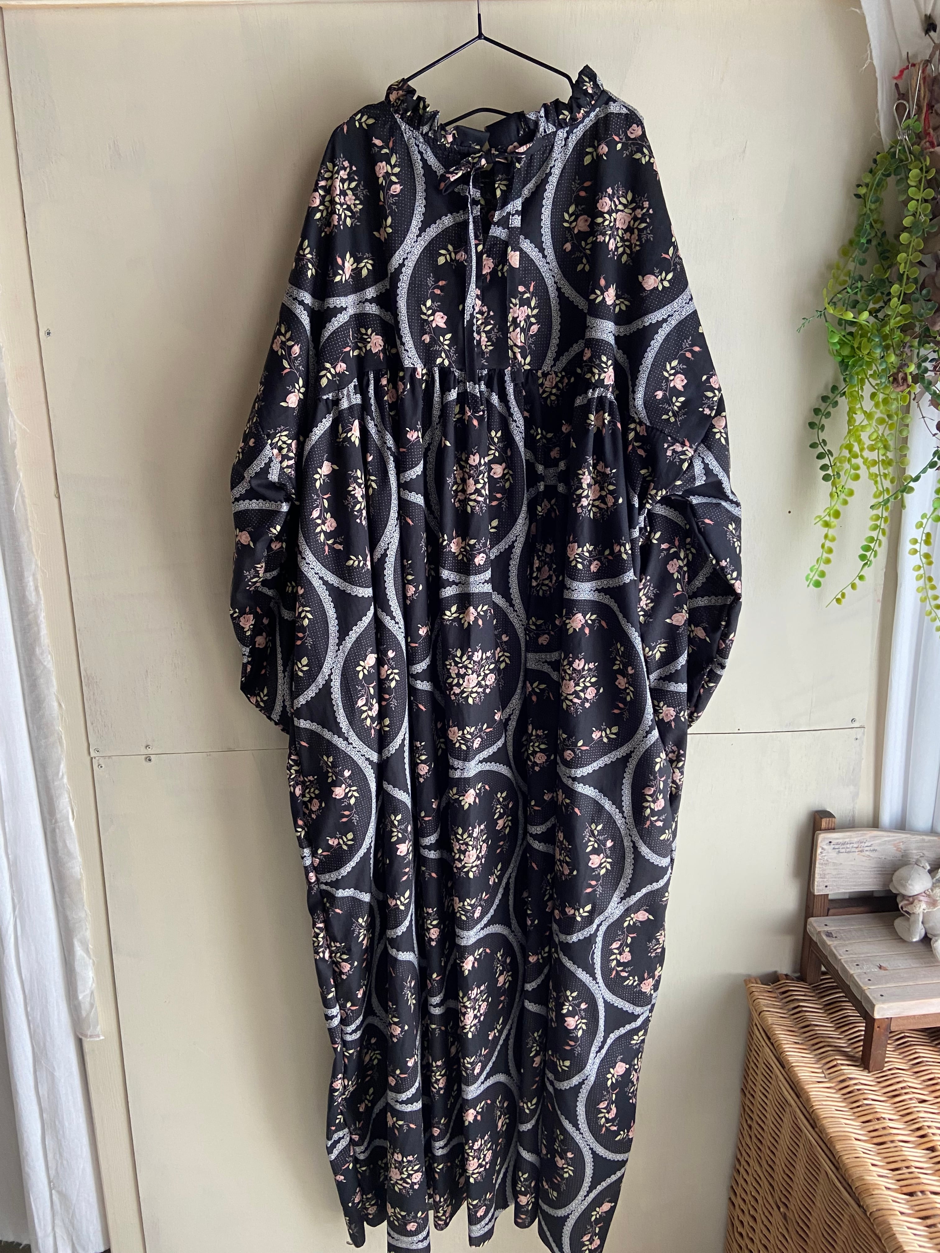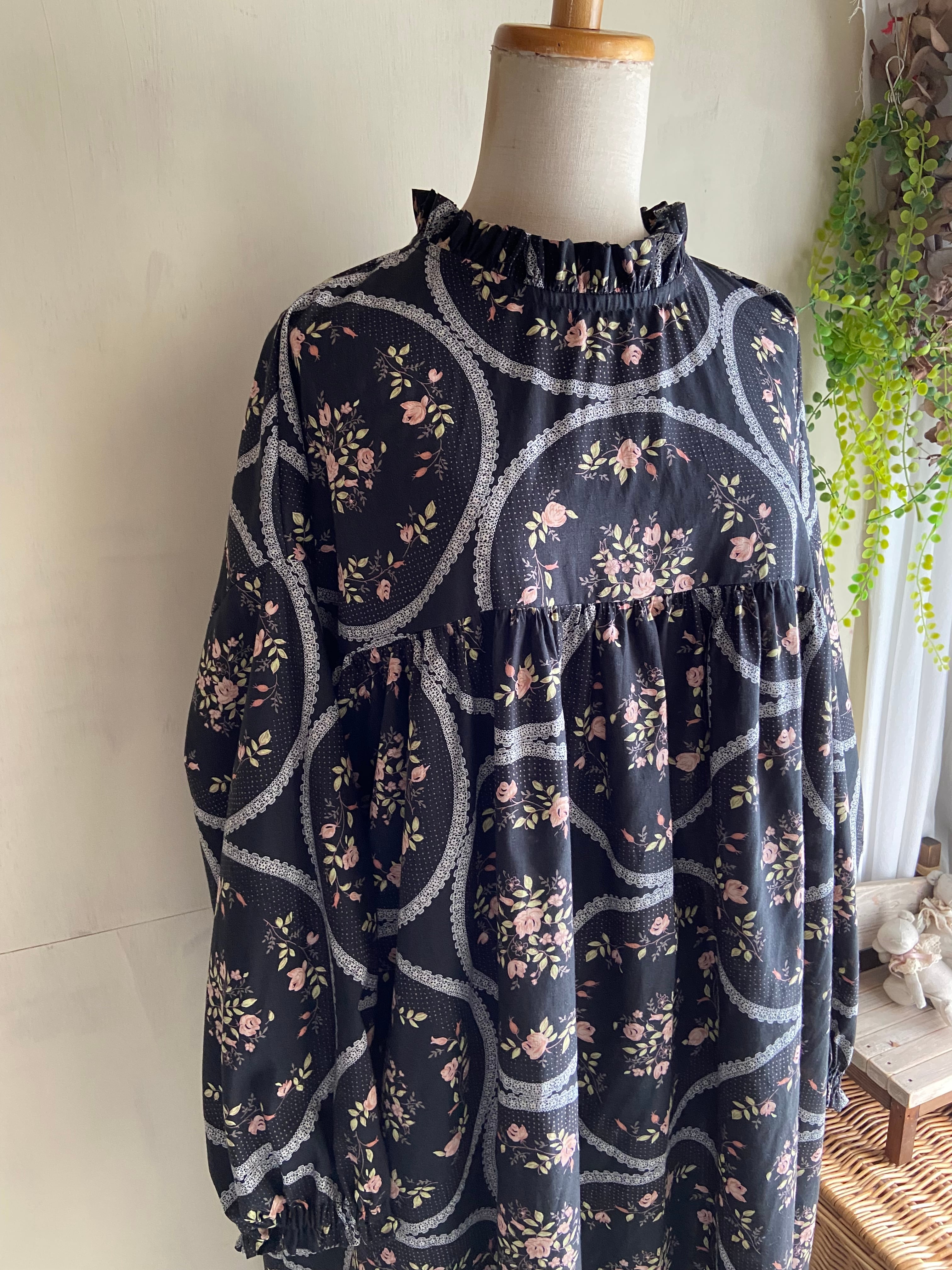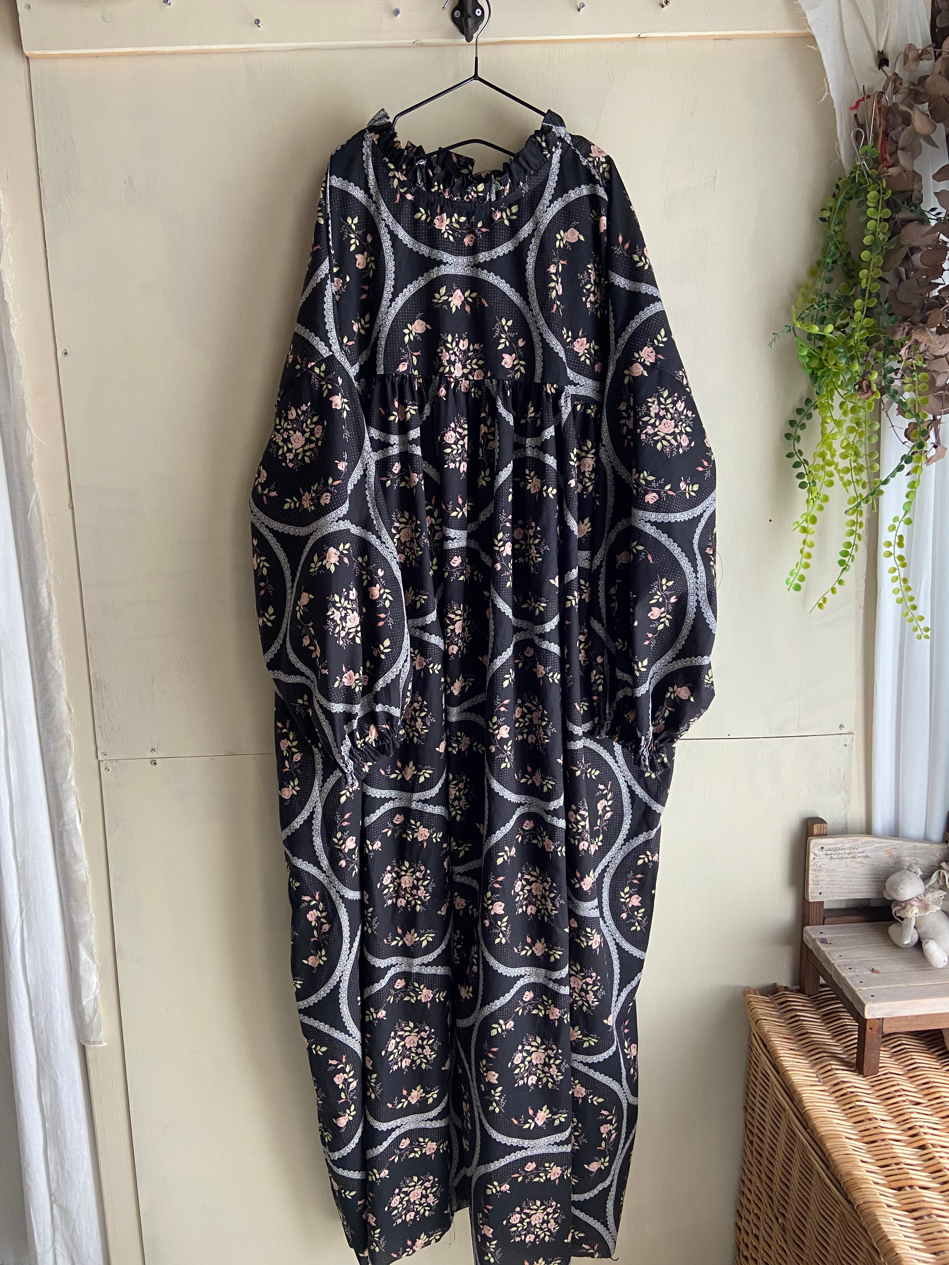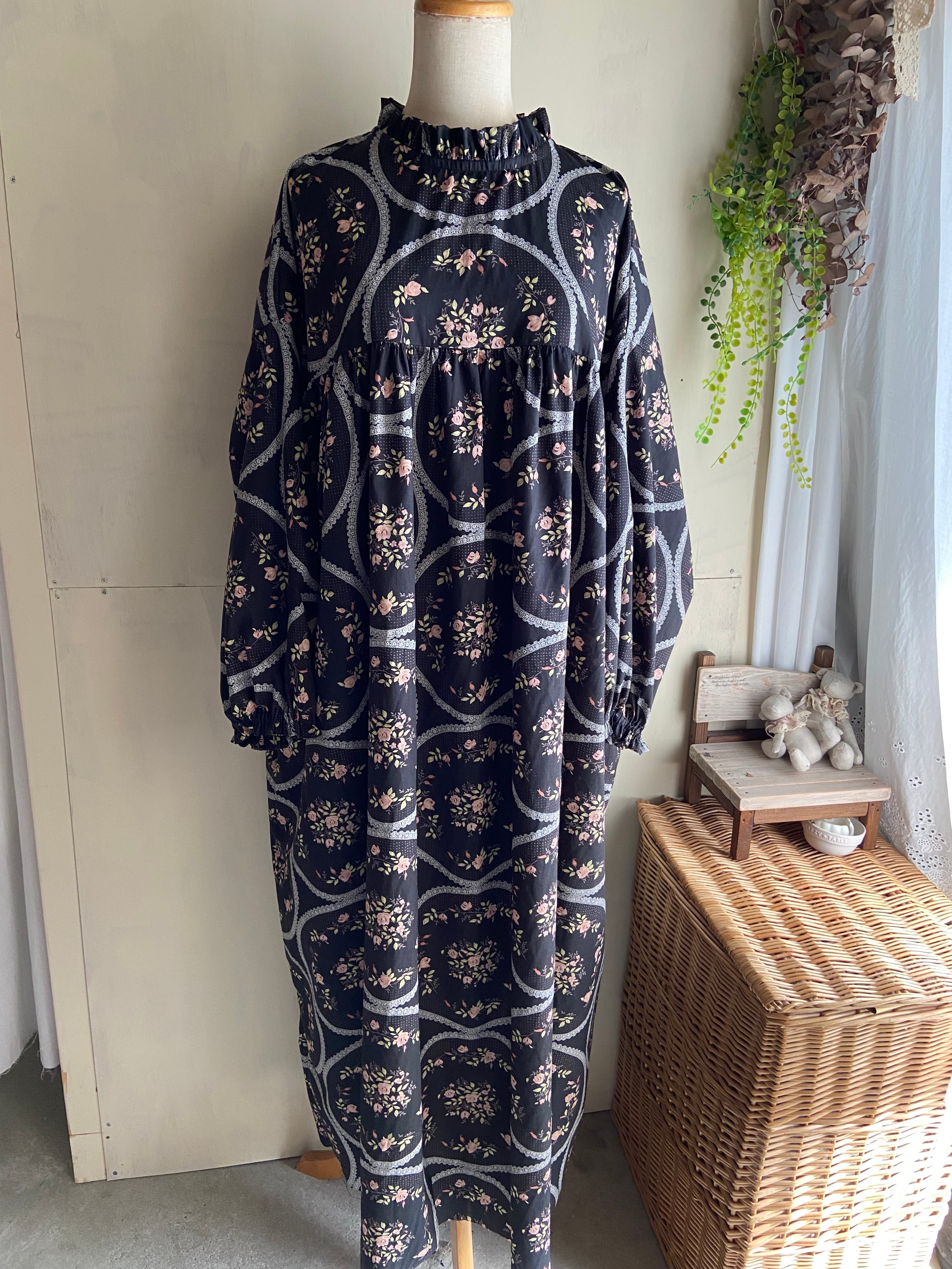 フリルヨークギャザーワンピース ドイリー小花 ブラック コットン コットンワンピース
