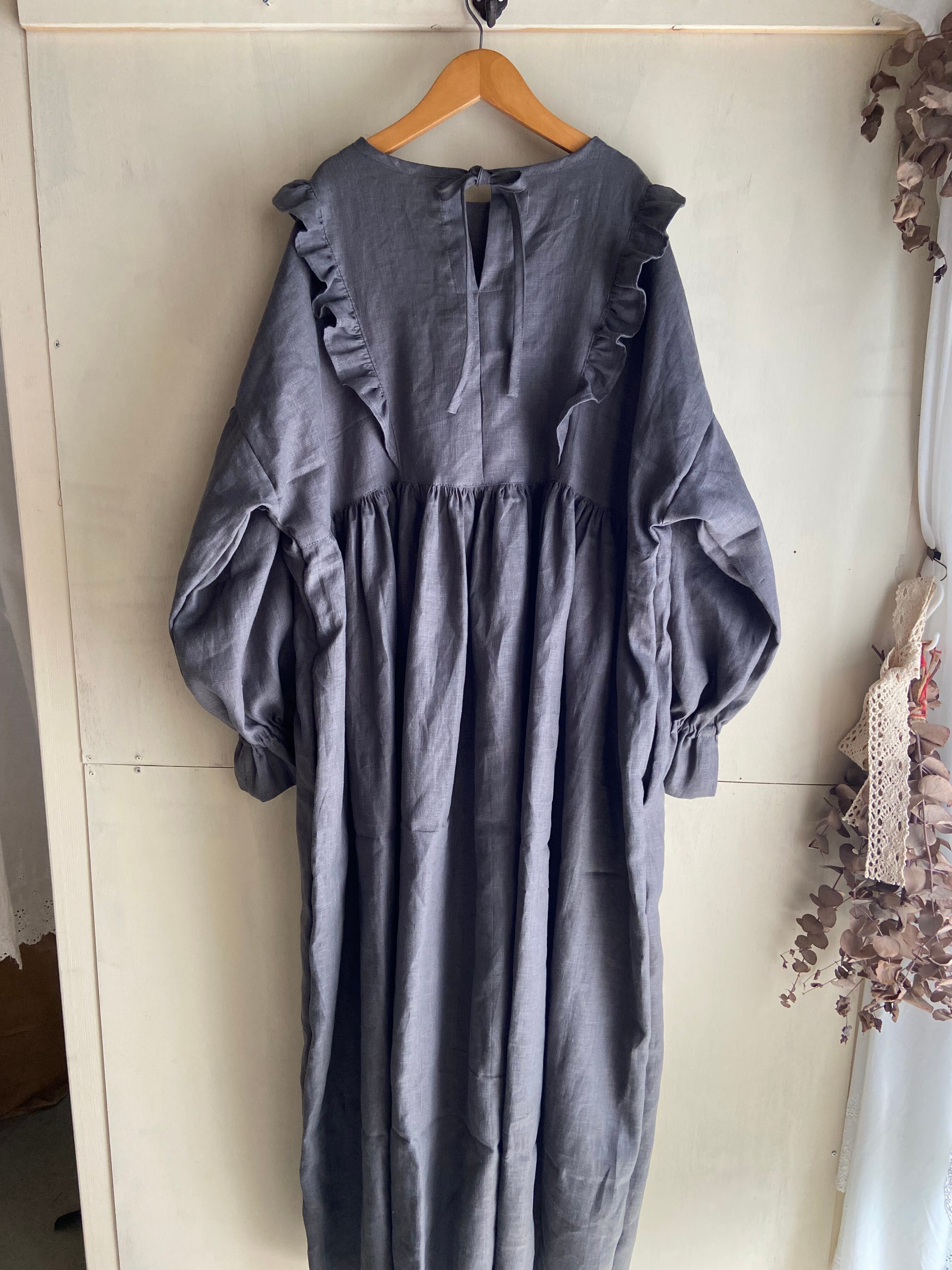 肩フリルのギャザーワンピース/フレンチリネン グレー